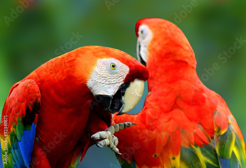 Fototapeta premium Sweet pair of scarlet macaw birds, red parrots