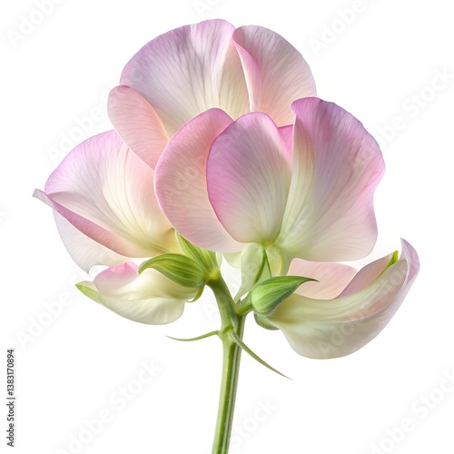 Fototapeta premium Sweet Pea flower, single sweet pea in full bloom, hyper-realistic, ultra-detailed delicate petals with soft pastel colors like pink, lavender, or white, soft natural lighting, high resolution, white b