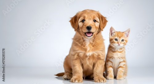 © Teddi, Fototapeta premium Sweet puppy and striped kitten posing happily as friends.
