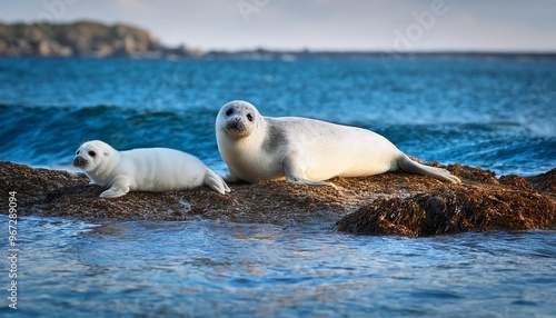© MSohail, Fototapeta premium Sweet seal pup and parent pair on a rocky shore
