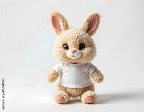 © unairakstudio, Naklejka premium Sweet stuffed bunny with big eyes wearing a plain white tee, isolated.