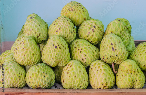 © pikyarm108, Obraz premium Sweetsop on table for sell, selective focus point.