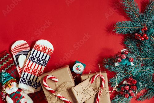 Fototapeta premium Świąteczna kompozycja szyszek, gałęzi świerkowych i stosu pudełek na czerwonym tle