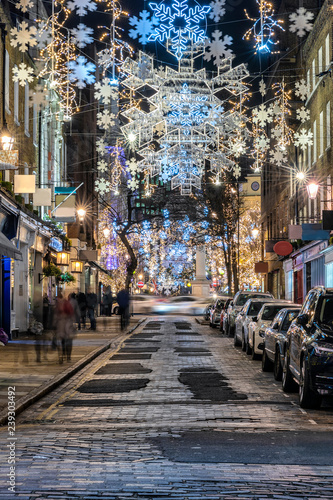 © moofushi, Obraz premium Świątecznie udekorowana ulica handlowa w Londynie w Boże Narodzenie w nocy