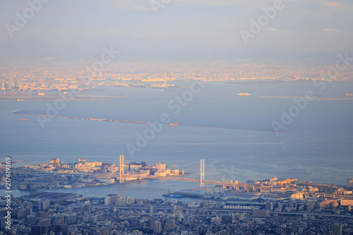 Fototapeta premium Światło słoneczne pada na wiszący most i oświetla zachodnią Osakę