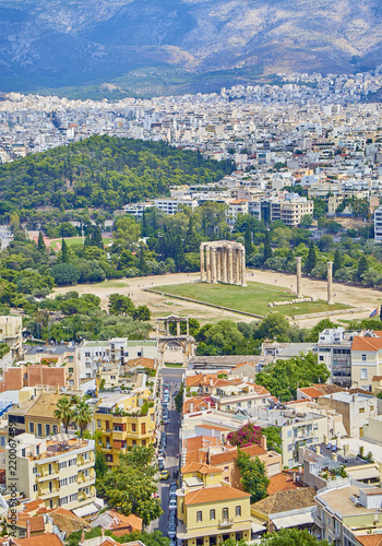 © Álvaro Germán Vilela, Fototapeta premium Świątynia Zeusa Olimpijskiego, monumentalne sanktuarium poświęcone Zeusowi, z aleją Lisikratous i łukiem Hadriana na pierwszym planie. Widok z punktu widokowego Akropolu w Atenach. Region Attyka, Grecja.
