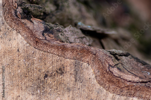 Fototapeta premium Świeżo ścięte drzewo pokazuje piękne słoje, szorstką korę i kambium w...
