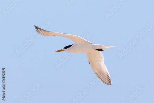 © gozzoli, Fototapeta premium Swift Tern or Greater Crested Tern (Thalasseus bergii) flying at Die Kom, Kommetjie, Western Cape South Africa, a popular birding hotspot