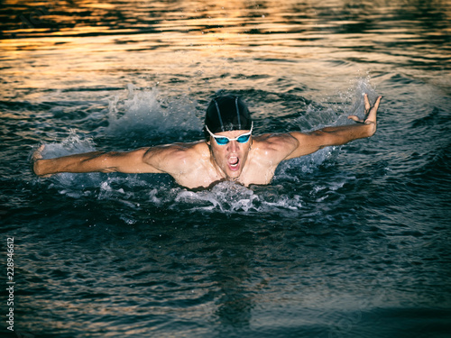 © Olga Khoroshunova, Fototapeta premium Swimmer breathing during swimming butterfly