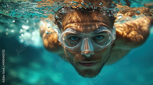 Naklejka premium Swimmer Diving Underwater in Crystal Pool