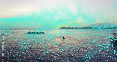 © vectorfusionart, Obraz premium Swimming adult in wetsuit in calm coastal water near covered motor boat with buoy and island