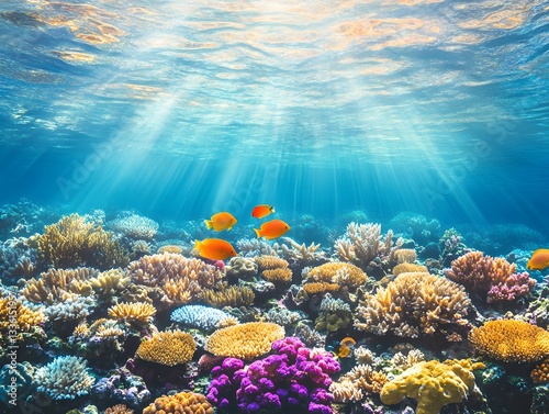 Naklejka premium Swimming Fish Above Coral Reef with Sun Rays Underwater Landscape