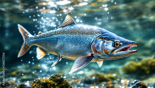 Fototapeta premium Swimming Fish in Clear Water with Sunlight and Rock Bed