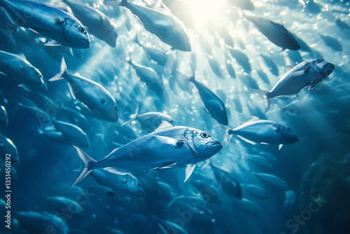 Fototapeta premium Swimming Fish School Underwater with Sunlight in Blue Ocean Scene