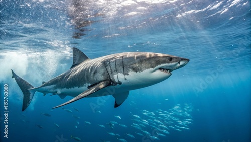 Fototapeta premium Swimming great white shark ocean depths wildlife photography underwater scene...