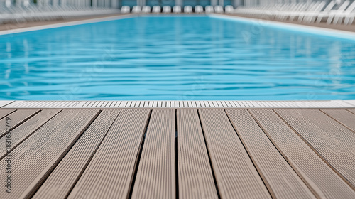 Obraz premium Swimming Pool Edge with Wooden Deck and Blue Water