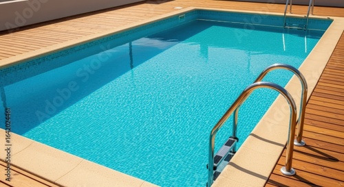 Obraz premium Swimming Pool with Clear Blue Water and Wooden Decking on a Sunny Day