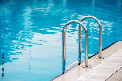 © fotofrol, Obraz premium Swimming pool with stair and wooden deck at hotel.