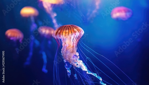 Fototapeta premium Swimming Scyphoid Jellyfish in a BokehFilled Ocean, Glowing Tentacles...