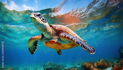Fototapeta premium swimming sea turtle in clear ocean water underwater scene