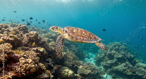 © Vanier Johanne, Fototapeta premium Swimming Sea Turtle Near Coral Reef Underwater Scene
