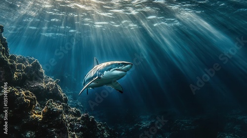 Fototapeta premium Swimming Shark in a Sunlit Ocean Environment Surrounded by Colorful Coral Reefs