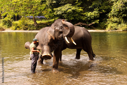 © vladislav333222, Naklejka premium swimming Sumatran elephants Tangkahan, Sumatra, Indonesia