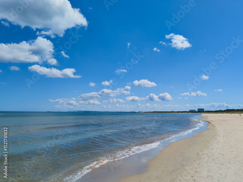 © Emil Lazar, Fototapeta premium Swinemünde -Polen. Ein Strand, blaue Himmel und weisse Wolken