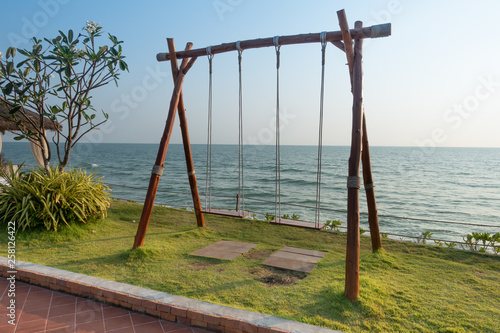 Fototapeta premium Swing in the garden beside the ocean and clear blue sky