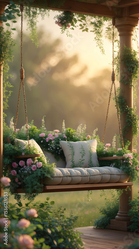 © SecretCanvas, Fototapeta premium Swing sofa with pillows surrounded by flowers and greenery in peaceful garden nature setting aesthetic nature wallpaper background