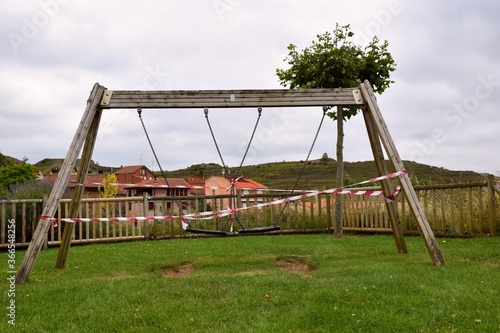 © Iker, Fototapeta premium Swings in a playground in Spain closed by the Sars-Cov-2 pandemic (covid19). Its use is prohibited by placing plastic tape. In the background houses from the village of Clavijo.