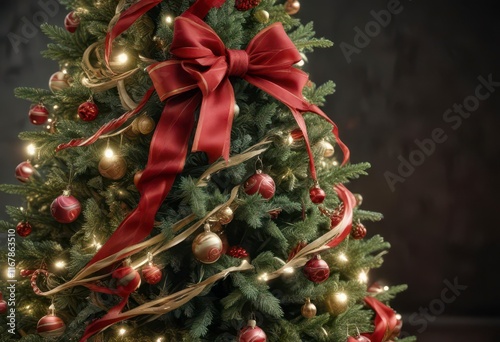 © Prayad, Fototapeta premium Swirl ribbons wrapped around a Christmas tree, Christmas, black background, banner