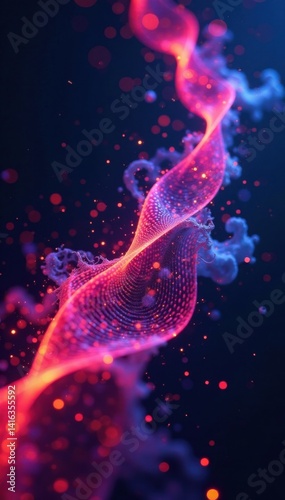 Naklejka premium Swirling abstract technology particles suspended in mid-air against a mesh background with geometric patterns and neon colors, tech, futuristic, particles