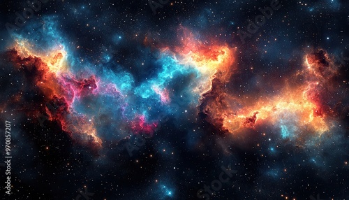 Fototapeta premium Swirling cosmic vortex with neon lights in space, glowing in blue, orange,...