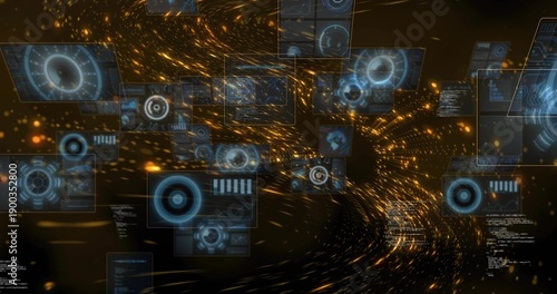 Fototapeta premium Swirling golden particle vortex and hologram panels drawing user into data...
