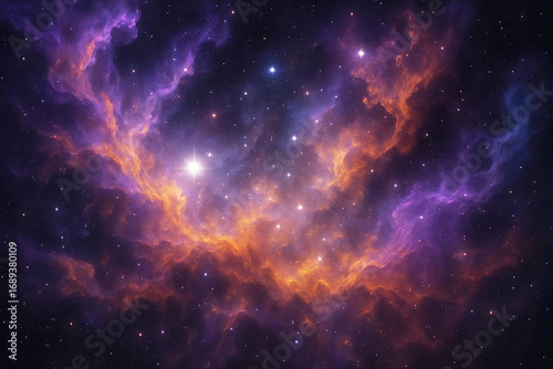 © DailyStock, Naklejka premium Swirling purple and orange cosmic nebula with a bright star in the center against a dark starry sky space