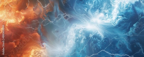 © Viktoriia, Obraz premium Swirling red and blue clouds are colliding, with lightning flashing between them, creating a dynamic abstract background full of energy. This image represents opposing forces clashing