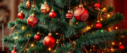 © Prasong, Fototapeta premium Swirling red, green, gold ornaments adorn a whimsical Christmas tree, radiating festive joy, festive background, photo