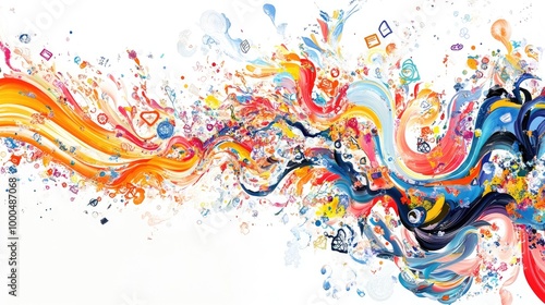 Fototapeta premium Swirling vibrant trails of educational symbols create a stunning abstract design on a white background, evoking knowledge and growth
