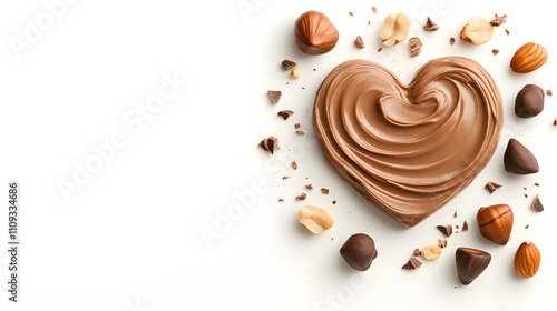 Fototapeta premium Swirls of chocolate hazelnut spread in a heart shape, surrounded by scattered...