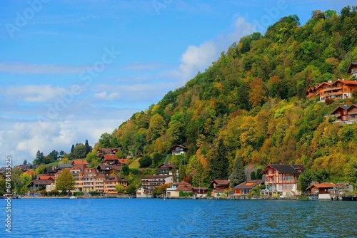 © surasak, Fototapeta premium Swiss houses and buildings surround elevated hill on blue sky background 2