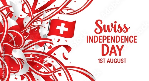Fototapeta premium Swiss Independence Day Celebration with Flag, Ribbons, and Confetti on White...