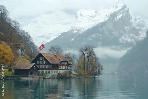 Fototapeta premium Swiss lake house, autumn mist, mountains