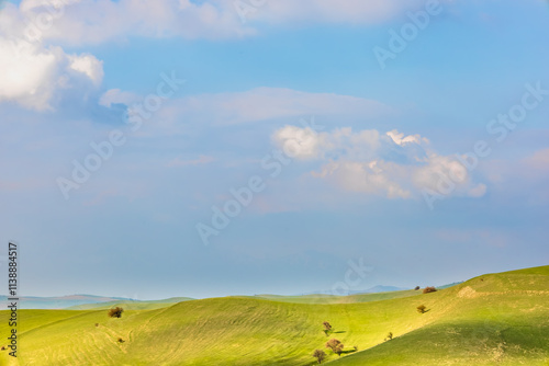 Fototapeta premium Swiss landscape theme background with green fields and beautiful sky