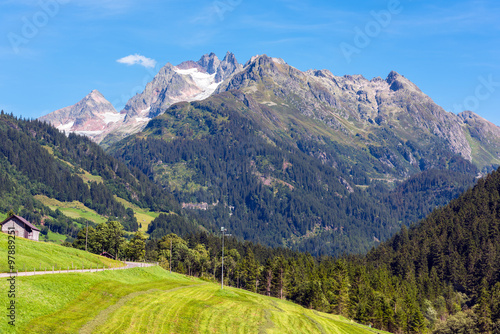 © dvoevnore, Fototapeta premium Swiss mountains with green land landscape