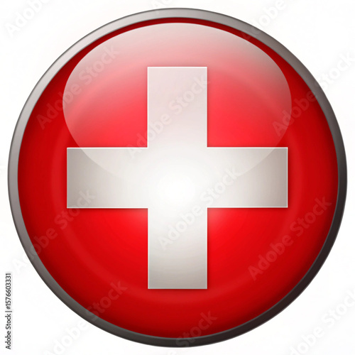 © Krishna, Obraz premium Swiss National Day Switzerland Flag Glossy Button isolated on white background.