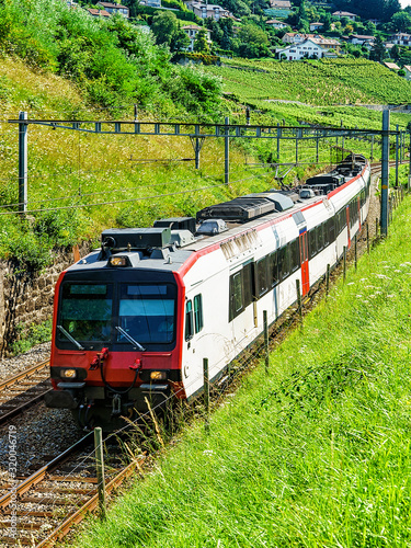 © Roman Babakin, Naklejka premium Swiss running train at Vineyard Terraces hiking trail of Lavaux, Lavaux-Oron district in Switzerland