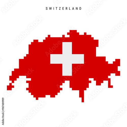 © Ivan Burchak, Obraz premium Switzerland pixel flag map icon. 8 bit pixel art Swiss map covered with flag. Flat vector illustration isolated on white background.