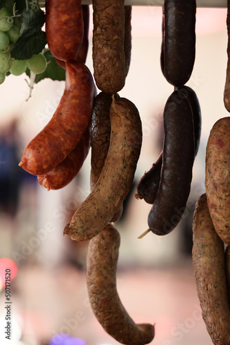 © FotoDax, Fototapeta premium Swojska tradycyjna kiełbasa wieprzowa wisi na haku.