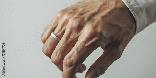 Fototapeta premium Swollen right hand with enlarged middle finger and wedding ring due to...